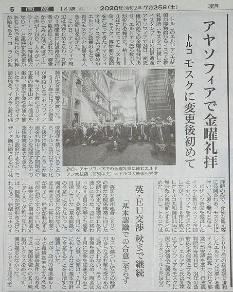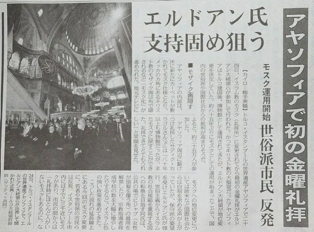 Tokyo Shimbun, "Ayasofya'da ilk cuma namazı" başlıklı haberinde, Istanbul'daki dünya mirasının 86 yıl sonra Erdoğan'ın kararıyla yeniden camiye dönüştürüldüğünü kaydetti.