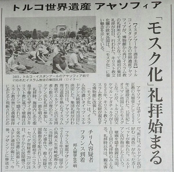 Yomiuri Shimbun, "Dünya mirası Ayasofya 'camileştirilerek' ibadete açıldı" başlığını kullandığı haberinde, Bizans İmparatorluğundan itibaren Ayasofya'nın tarihine ve İstanbul'un fethiyle Osmanlı Devleti'nin kontrolüne geçmesine değinildi.