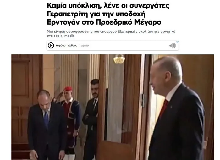 Söz konusu ziyaret Yunan basınında büyük yankı uyandırdı. Hatta Yunanistan Dışişleri Bakanı'nın başkan Erdoğan'ın kapıda görününce eğilmesi Yunan basınında büyük eleştiri konusu oldu.