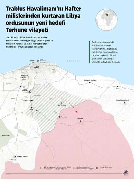 Libya Ulusal Mutabakat Hükümeti (UMH) güçleri, başkent Trablus'un 90 kilometre güneydoğusundaki Terhune kentini Hafter milislerinden temizleyerek kontrol altına aldı. UMH güçleri yaptığı açıklamada, Terhune kentini Hafter'e bağlı milislerden kurtardıklarını ve kentte kontrolü tamamen sağladıklarını duyurdu. Terhune'den kaçan milislerin Cufra Hava Üssü'ne gittiği bildirildi.