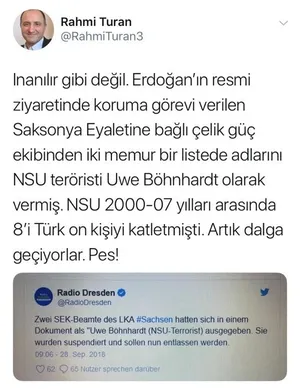 Erdoğan'ın Almanya ziyareti sırasında görev alan iki polis memurunun NSU cinayetlerinin faillerinden Uwe Böhnhardt'ın ismini görev takma adı olarak kullandığı ortaya çıktı. Polisler hakkında soruşturma başlatıldı.