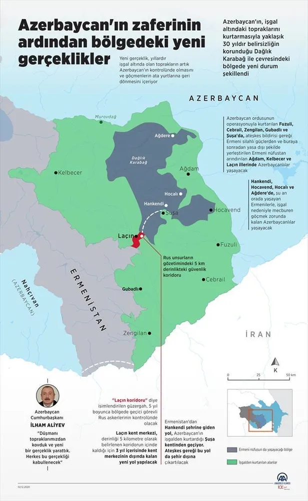 Azerbaycan Cumhurbaşkanı İlham Aliyev'in, "Düşmanı topraklarımızdan kovduk ve yeni bir gerçeklik yarattık. Herkes bu gerçekliği kabullenecek." diye nitelendirdiği yeni gerçeklik, yıllardır işgal altında olan toprakların artık Azerbaycan'ın kontrolünde olmasını ve göçmenlerin ata yurtlarına geri dönmesini içeriyor.