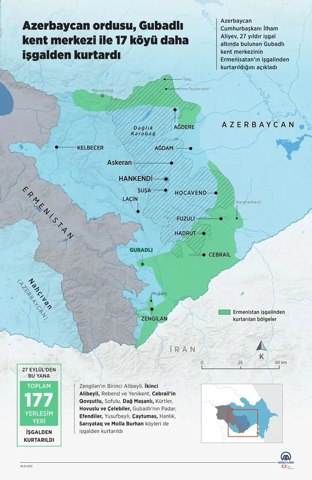 Azerbaycan 27 Eylül'de başlattığı topraklarını işgalden kurtarma operasyonunda 4 şehir, 3 kasaba ve 170 köyü kurtarmıştı.