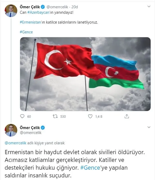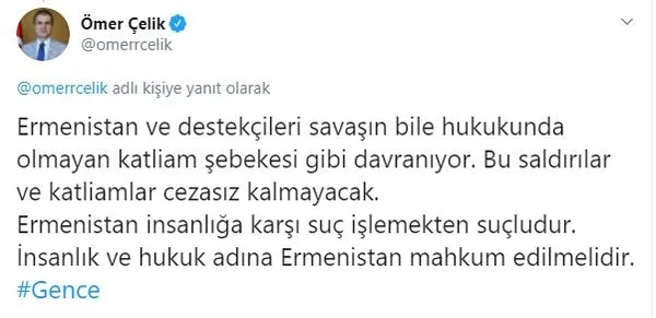 AK Parti Sözcüsü Ömer Çelik sosyal medya hesabı Twitter üzerinden yaptığı açıklamada "Ermenistan bir haydut devlet olarak sivilleri öldürüyor. Acımasız katliamlar gerçekleştiriyor. Katiller ve destekçileri hukuku çiğniyor. Gence'ye yapılan saldırılar insanlık suçudur. Ermenistan ve destekçileri savaşın bile hukukunda olmayan katliam şebekesi gibi davranıyor. Bu saldırılar ve katliamlar cezasız kalmayacak. Ermenistan insanlığa karşı suç işlemekten suçludur. İnsanlık ve hukuk adına Ermenistan mahkum edilmelidir. " dedi.