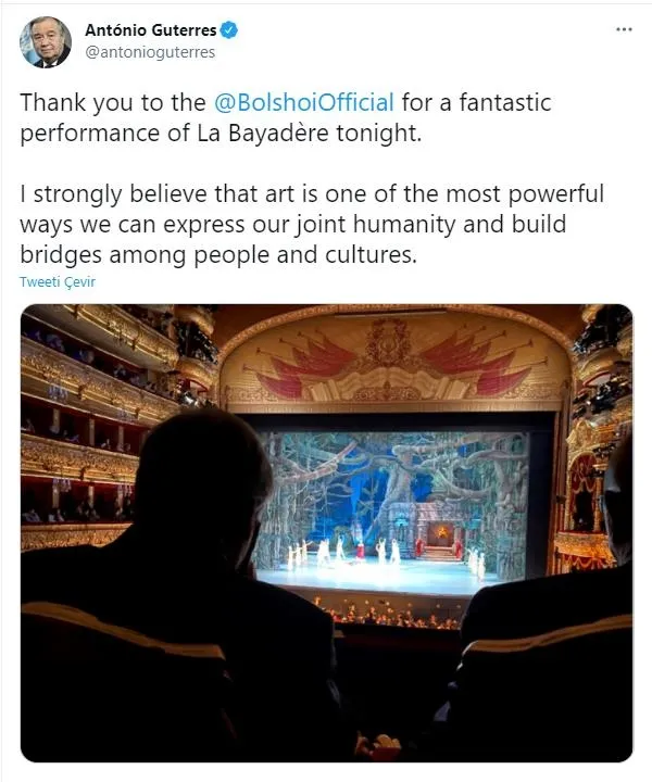 Terörist İsrail devleti Filistin'de aralarında çocukların da olduğu 109 masum kişiyi şehit ederken Birleşmiş Milletler Genel Sekreteri Antonio Guterres bale gösterisi izledi. Bale gösterisi sırasında Twitter üzerinden de skandal bir Gazze çağrısında bulundu.