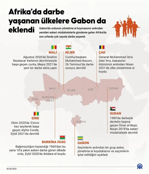 Sudan, Çad, Mali, Burkina Faso ve Nijer'in ardından Gabon'da da tartışmalı seçim sonrası ordu yönetime el koyduğunu açıkladı.
