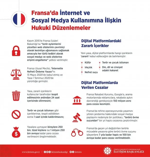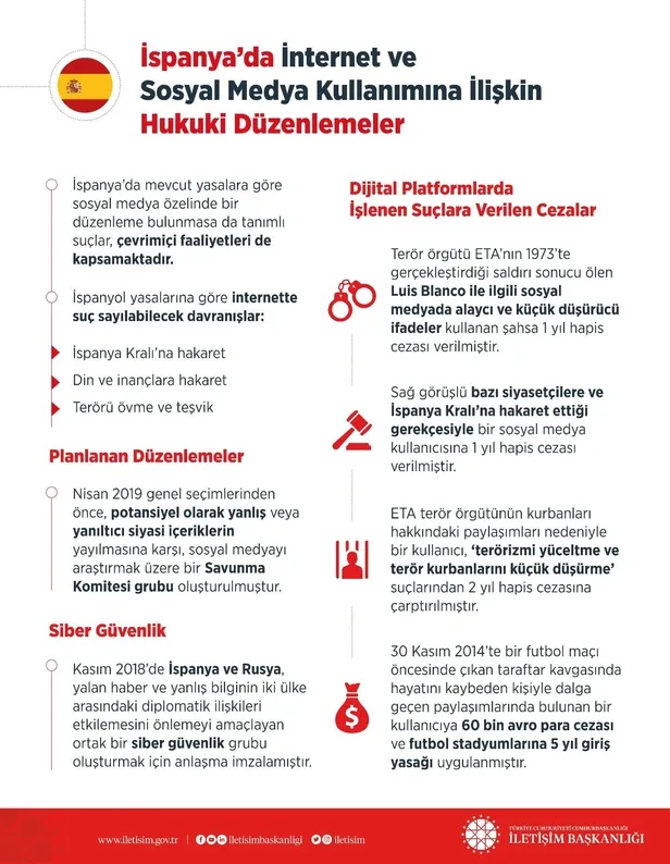 İletişişm Başkanlığı, sosyal medya hesabı Twitter'dan, "İnternet ve sosyal medya kullanımına ilişkin hukuki düzenlemelere dair dünyadaki uygulama örnekleri: İspanya'da mevcut yasalara göre internette suç sayılabilecek davranışlar neleri kapsıyor, dijital platformlarda işlenen suçlara ne tür cezalar veriliyor?" ifadeleriyle infografik bir paylaşım yapıldı.