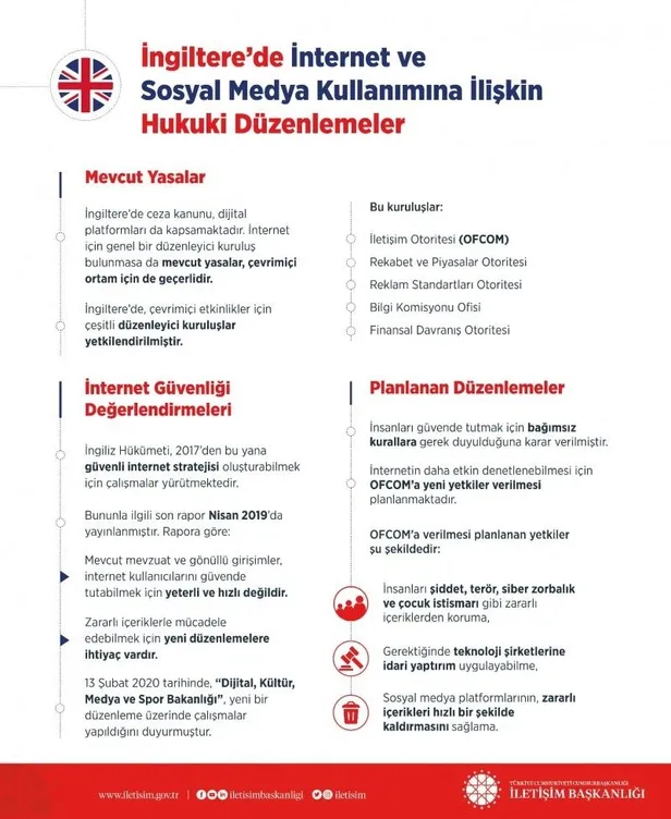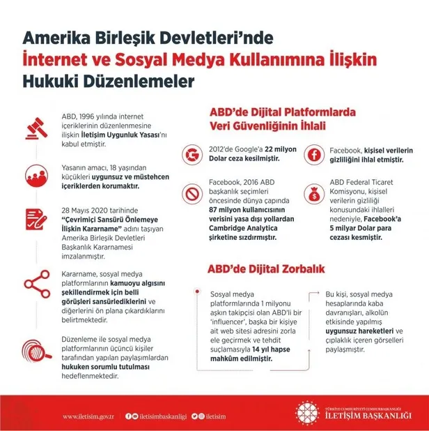 İletişim Başkanlığı, Türkiye'nin gündemindeki internet ve sosyal medya kullanımına ilişkin hukuki düzenlemelere dair paylaşımda bulundu. Yapılan infografik paylaşımda, İspanya'daki internet ve sosyal medya kullanımına ilişkin düzenlemelerden örnekler yer aldı.