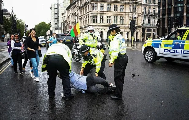 Son dakika haberine göre, İngiltere'de parlamento önünde protesto gerçekleştiren terör örgütü PKK sempatizanı, Başbakan Boris Johnson'ın aracının önüne atladı. Johnson'ın aracına kaza yaptıran terör örgütü PKK'lı gözaltına alındı.