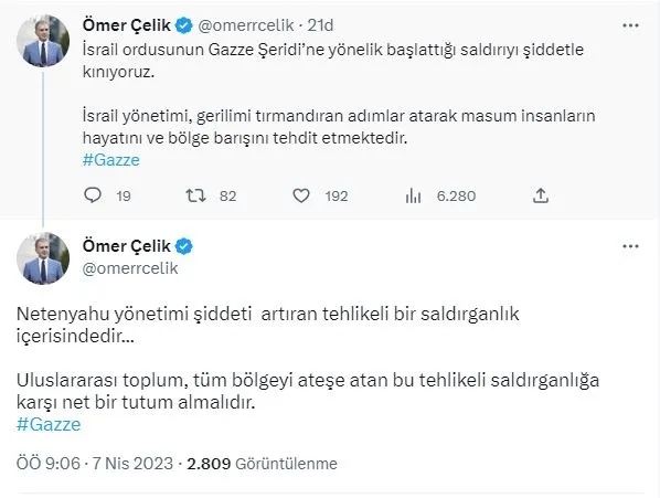 AK Parti Sözcüsü Ömer Çelik İsrail'in saldırılarına tepki gösterdi. Çelik yaptığı açıklamada, "İsrail ordusunun Gazze Şeridi'ne yönelik başlattığı saldırıyı şiddetle kınıyoruz. Netanyahu yönetimi, şiddeti artıran tehlikeli bir saldırganlık içerisindedir. Uluslararası toplum, tüm bölgeyi ateşe atan bu tehlikeli saldırganlığa karşı net bir tutum almalıdır." ifadelerini kullandı.