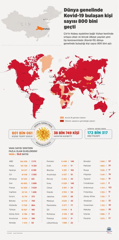 Çin'in Hubey eyaletine bağlı Vuhan kentinde ortaya çıkan ve birçok ülkeye yayılan yeni tip koronavirüse (Kovid-19) yakalanan 801 bin kişiden 172 bini sağlığına kavuştu.
