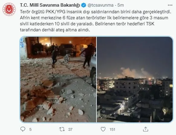 MSB: Terör örgütü PKK/YPG insanlık dışı saldırılarından birini daha gerçekleştirdi. Afrin kent merkezine 6 füze atan teröristler ilk belirlemelere göre 3 masum sivili katlederken 10 sivili de yaraladı. Belirlenen terör hedefleri TSK tarafından derhâl ateş altına alındı.