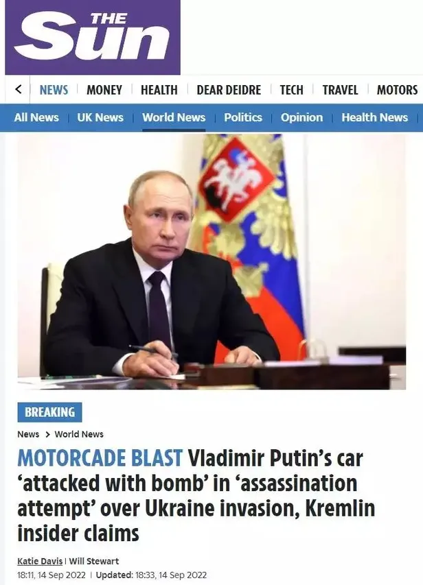 İngiliz The Sun gazetesinde yer alan haberde saldırıya uğrayan limuzinde Putin'in olmadığı ifade edildi.