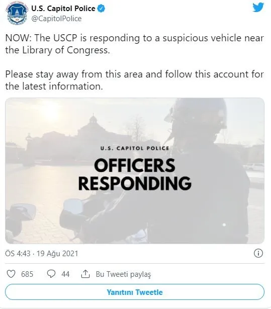 ABD Kongre Polisi tarafından yapılan açıklamada, memurların ABD Kongre Binası ile ABD Yüce Mahkemesi Binası arasında yer alan Kongre Binası Kütüphanesi yakınlarındaki şüpheli bir araca yanıt verdiğini belirtilerek, kütüphanenin çevresinin ve ABD Cannon House Ofis Binası'nın tahliye edildiği kaydedildi. Ayrıca polis yakınlardaki kongre personeli ofislerini de tahliye ederek, insanları sakin kalmaya ve gerekirse bölgeden uzaklaşmak için yeraltı tünellerini kullanmaya teşvik etti.