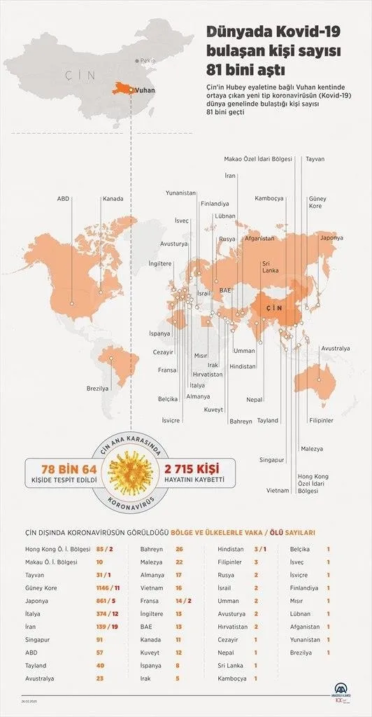 Yeni tip corona virüsü salgını hızla yayılmaya devam ediyor. Son verilere göre dünya genelinde 81 bini aşkın kişi yakalanmış durumda.