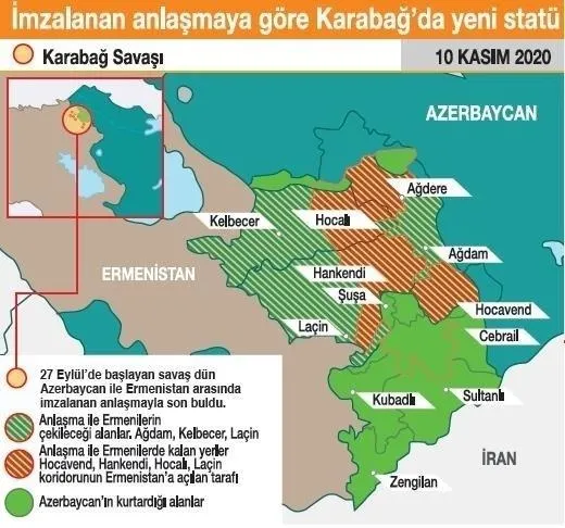 Dağlık Karabağ'ın Ermeni işgalinden tamamen kurtulması için imzalanan ateşkes anlaşmasına dair takvim işlemeye başladı. Akşam gazetesinin haberine göre, Ateşkesin korunması ve denetlenmesi için Türkiye ve Rusya ortak bir mekanizma işletecek.