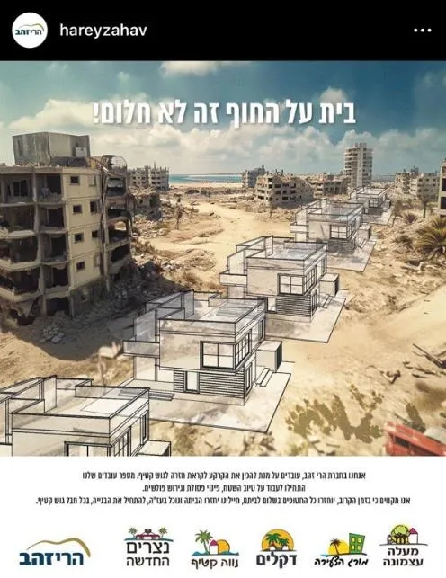 Yerleşim yerlerini geliştirme şirketlerinden biri olan "Harei Zahav", Instagram hesabından paylaştığı mesajlarında "Gazze yerleşimlerinin" reklamını yapıyor.