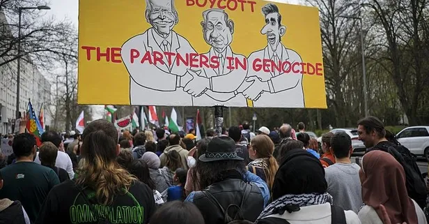Daha sonra yürüyüş gerçekleştiren göstericiler, "Filistin'i İsrail işgalinden kurtarın", "İşgalin son günü barışın ilk günü olacak" ve "Çalınan topraklarda barış olmaz" yazan döviz ve pankartlar taşıdı.