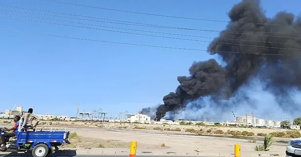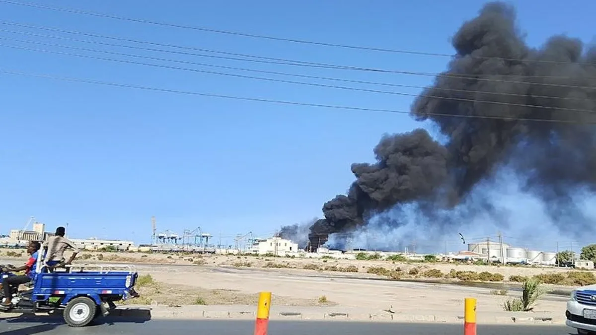 Sudan'ın doğusundaki Port Sudan kentinde bulunan Güney Limanı'nda şiddetli patlamaların ardından yangın çıktı. Limandan yoğun dumanlar yükseldi. (AA)