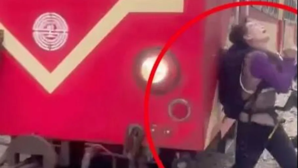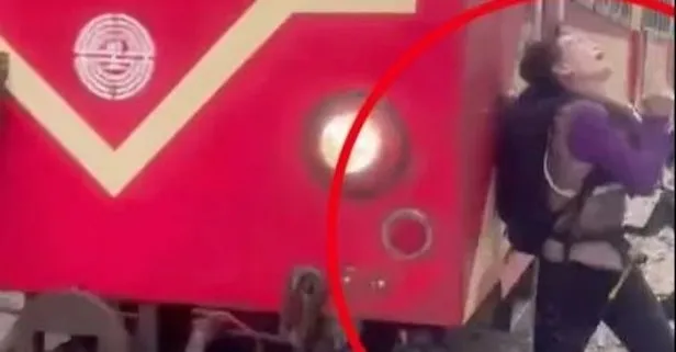 Tren raylara çok yakın olan kadın sağ omzuna çarparken turist yere düşüyor.