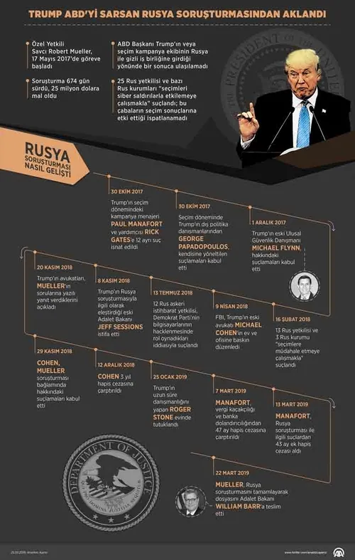 Yaklaşık 2 yıl süren, 25 milyon dolara mal olan ve Amerikan kamuoyunu ciddi şekilde meşgul eden Rusya soruşturması, Trump'ın görevden alınmasına yol açıp açmayacağı tartışmalarıyla ülke ve dünya gündemini önemli ölçüde belirledi.