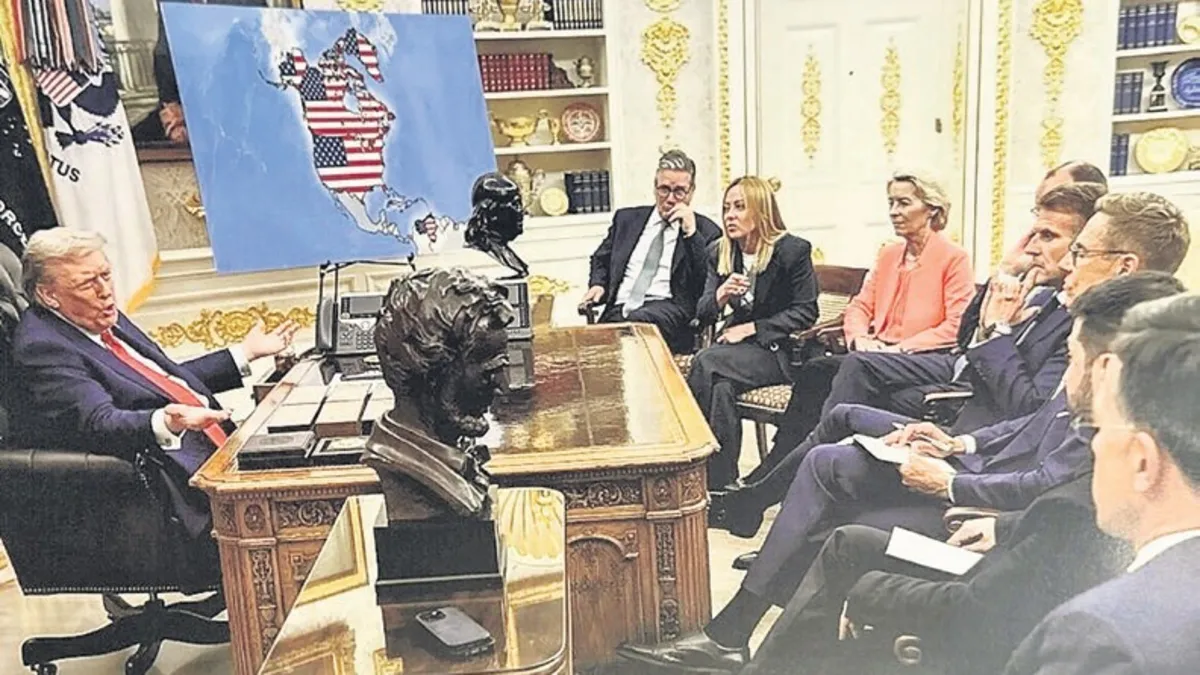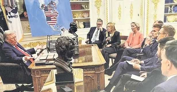 Trump Avrupa liderleriyle bir toplantı yaptı ve harita masanın yanında yer aldı. Trump,aynı gün sosyal medya hesabından paylaştığı görselde, Danimarka'ya bağlı özerk bölge Grönland topraklarının "2026'da kurulan ABD toprağı" olarak tasvir eden bir görsel paylaştı.