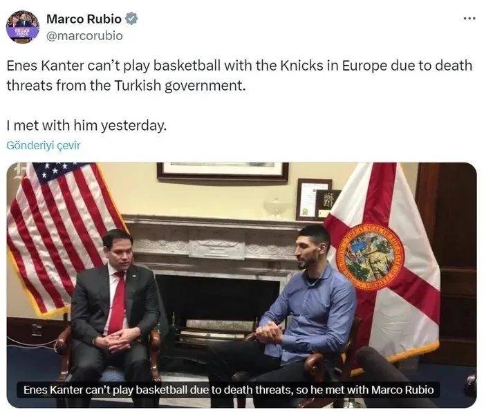 Donald Trump'ın kabinesinde yer alacak isimler arasında yer alan Florida Senatörü Marco Rubio'nun, FETÖ mensubu Enes Kanter ile geçmişte gerçekleştirdiği temas yeniden gündeme geldi. Ocak 2019'da bir araya gelen Rubio ve FETÖ'cü Kanter, Türkiye'yi sert şekilde eleştiren açıklamalarda bulunmuştu. Görüşme sırasında FETÖ'cü Kanter, Türkiye hakkında iftiralar atarak sözde insan hakları ihlalleri ve ailesinin yaşadığı zorluklara dair Rubio'ya bilgi vermişti. Senatör Rubio ise bu görüşmenin bir kısmını YouTube üzerinden paylaşarak, Türkiye'nin insan hakları ve demokrasi konusundaki politikalarını eleştirip, FETÖ'cü Kanter'in cesaretini ve açık sözlülüğünü övgü olmasından bahsetmişti.