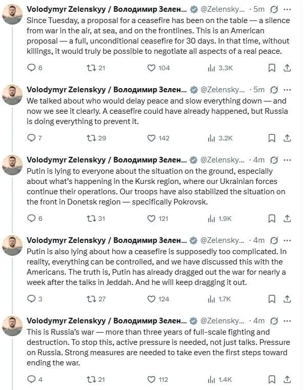 Ukrayna Devlet Başkanı Volodimir Zelenskiy X hesabından yaptığı paylaşımda Putin'in yalan söylediğini, Rusya'nın ateşkesi engellemek için her şeyi yaptığını iddia etti.