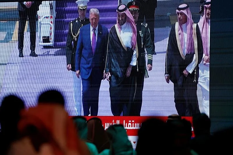 Suudi Arabistan'da insanlar, ABD Başkanı Donald Trump'ın başkent Riyad'daki Kral Halid Uluslararası Havalimanı'na gelişinde Suudi Veliaht Prens Muhammed bin Selman ile görüşmesini gösteren bir ekranı izledi.