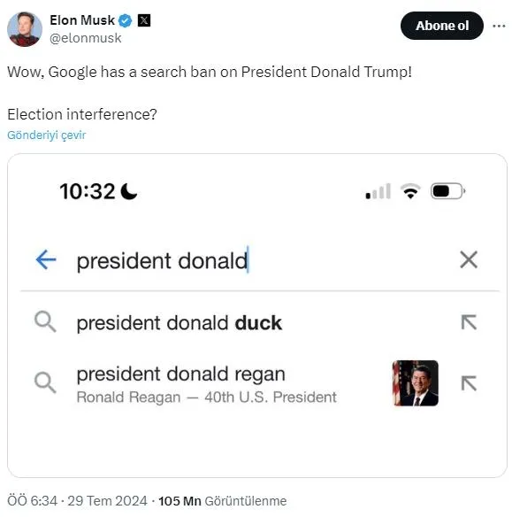 Musk, Google arama motoruna "President Donald" yazdığında Google'ın arama önerisi olarak "President Donald Duck" ifadesini sunduğunu belirtti ve arama sonuçlarının ekran görüntüsünü paylaştı.