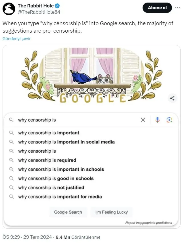 Google'da yapılan bir diğer arama ise politikayı açıkça ortaya koydu. Arama motoruna "Sansür neden" yazıldığında çıkan önerilerin çoğu sansür yanlısı.