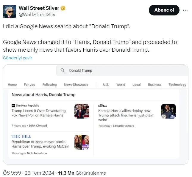 Google'da çıkan bir diğer arama sonucu ise Trump'a yönelik sansürü bir kez daha gözler önüne serdi. Google'da "Donald Trump" konusundaki "haber" aramasında Biden'dan sonra Demokratların adayı olması beklenen Kamala Harris'e yönlendirme yapıldı.