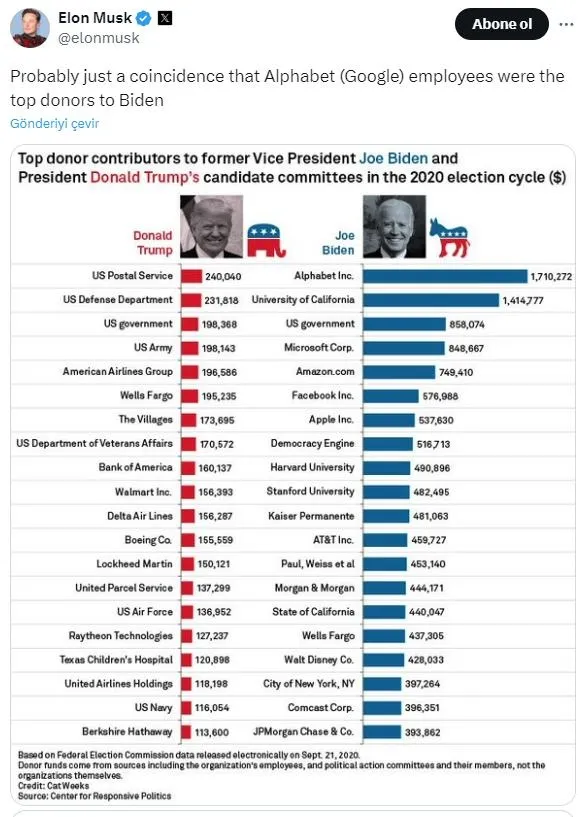 İddiaya göre Biden'a en büyük destekte bulunan bağışçılar Alphabet yani Google çalışanı.