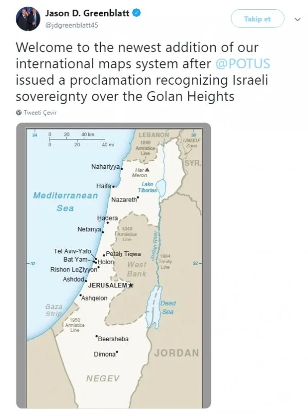 Golan Tepeleri'ni İsrail toprağı olarak gösteren bir harita paylaşan Greenblatt, "Trump'ın, Golan Tepeleri üzerinde İsrail egemenliğini tanıyan bir bildiri yayınlamasının ardından uluslararası harita sistemimizdeki yeni ilaveye hoş geldiniz" ifadelerini kullandı.