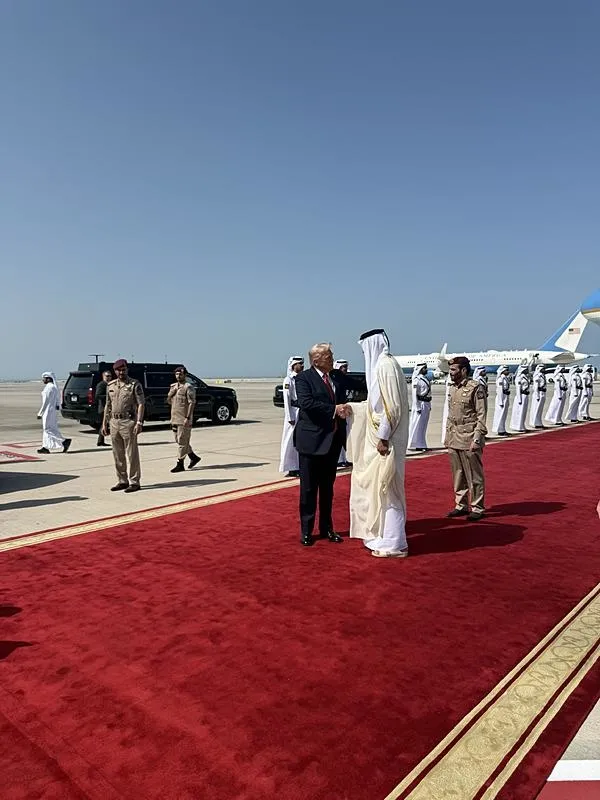 ABD Başkanı Donald Trump Orta Doğu ziyareti kapsamında Suudi Arabistan’dan Katar’a geçti.Trump Katar'da 8 savaş uçağıyla karşılanırken Beyaz Saray Basın Sözcüsü Karoline Leavitt, "Katar savaş jetleri Air Force One ve Başkan Trump’ı karşılıyor. Çok havalı" şeklinde paylaşım yaptı. Trump'ın Katar Emiri Şeyh Temim bin el Sani ile bir araya geldi. Trump Doha'dan yaptığı açıklamada "Katar 160 tane uçak alacak. Anlaşmamız 200 milyar doların üstünde" ifadelerini kullandı. Trump'ın el Sani ile kılıç dansı izlediği görüntüler ise gündem oldu. Trump, Katar'ın 42 milyar dolarlık askeri alım yapacağını ve Katar'daki el-Udeid üssünü geliştirmek için 10 milyar dolar yatırım yapacağını söyledi.