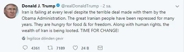 Trump, Twitter hesabından yaptığı açıklamada, "İran Obama yönetiminin kendileriyle yaptığı berbat anlaşmaya rağmen her seviyede başarısız oluyor. Mükemmel İran halkı yıllardır baskı altında bulunuyor. (Onlar) yiyecek ve özgürlüğe açlar. İnsan haklarıyla birlikte, İran'ın varlığı yağmalanıyor. DEĞİŞİMİN ZAMANI" ifadesini kullandı.