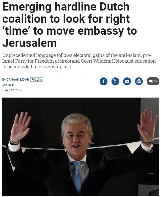Hollanda'da koalisyon anlaşmasının en güçlü yansıması İsrail basınında meydana geldi. The Times of Israel, Wilders'ı "İsrail'in güçlü bir destekçisi" olarak nitelendirirken Wilders'in gençliğinde bir yıl boyunca İsrail'in Moshav Tomer kentinde yaşadığını belirtti.