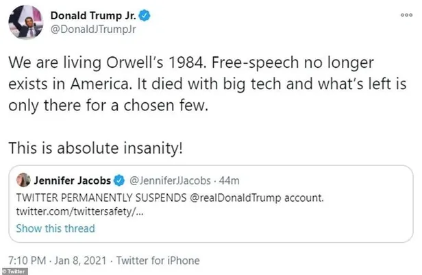 Trump'ın büyük oğlu ve yardımcılarından Donald Trump Jr. ise son Twitter paylaşımında yaşananları George Orwell'in 1984 adlı ünlü romanına referans vererek anlattı.