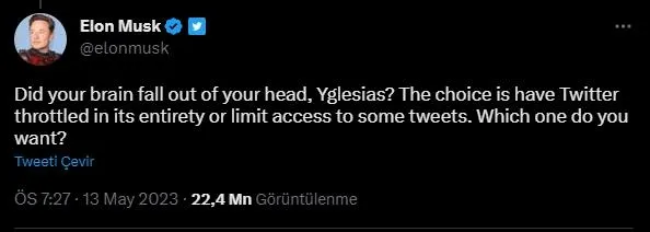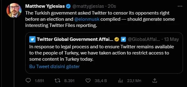 Türkiye, tarihinin en önemli seçimlerinden birinde sandık başında. Uluslararası ajanslar manşetlerinde seçime yönelik analizlere sıklıkla yer vermiş ve algı operasyonlarıyla 14 Mayıs'taki millet iradesine müdahale etmeye çalışmıştı. Sosyal medya platformu Twitter, Türkiye'deki seçimlerde operasyonel hesaplara engelleme getirdi. Twitter Global'den yapılan açıklamada, "Türkiye'de Twitter'ın kullanıma açık kalmasını sağlamak amacıyla, bazı içeriklerin erişimine engel getirdik" denildi. Küresel çetenin ABD'li üyesi Bloomberg çalışanı Matthew Yglesias, "Türk hükümeti, Twitter'dan seçimden hemen önce muhaliflerini sansürlemesini istedi ve Elon Musk buna uydu" diyerek algı operasyonu başlattı. Yglesias'a yanıt veren Twitter'ın sahibi Elon Musk, "Beynin yerinde mi? dedi. Twitter'ın bu kararı sonrası oldukça üzülen FETÖ'cüler "Twitter Türkiye'de Erdoğan'ın rakiplerini engelliyor" algısını sahaya sürmek için sosyal medyada büyük çalışma başlattı. Hainlerin önde gelen isimlerinden FETÖ'cü Emre Uslu yaptığı paylaşımla her şeyi gözler önüne serdi.