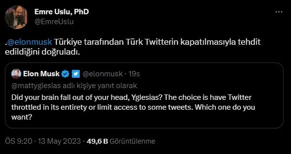 Musk'ın tweetini alıntılayan FETÖ'cü Emre Uslu skandal ifadelerle Türkiye ve hükümeti aldı. Türkiye'nin seçim güvenliği için attığı bu adamı kendi kirli algı operasyonlarını gerçekleştiremeyeceği için tehdit olarak lanse eden Uslu, "Türkiye tarafından Türk Twitterin kapatılmasıyla tehdit edildiğini doğruladı." diyerek servis etti.