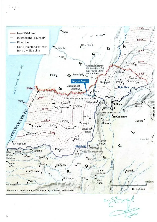BM Güvenlik Konseyi'nin 1701 sayılı kararı, İsrail'in Mavi Hattı'nın gerisine çekilmesini ve bu hatla Lübnan'daki Litani Nehri arasındaki bölgenin silahsızlandırılmasını, burada sadece Lübnan ordusu ve Birleşmiş Milletler Lübnan Geçici Barış Gücü'ne (UNIFIL) ait silah ve askeri araç-gerecin bulundurulmasını öngörüyor.