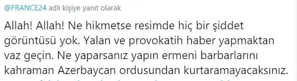 Bir başka sosyal medya kullanıcısı ise "Allah! Allah! Ne hikmetse resimde hiç bir şiddet görüntüsü yok. Yalan ve provokatif haber yapmaktan vazgeçin. Ne yaparsanız yapın Ermeni barbarlarını kahraman Azerbaycan ordusundan kurtaramayacaksınız." ifadeleriyle tepkisini dile getirdi.