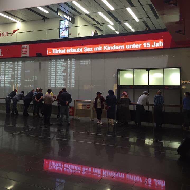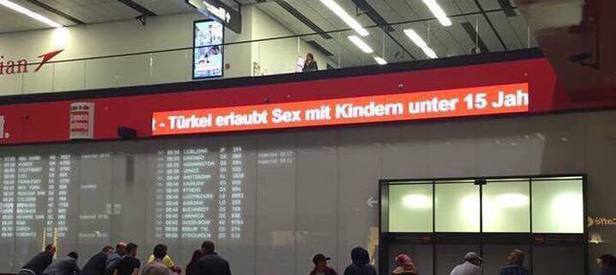Viyana Havalimanı'nda, "Türkiye'de 15 yaşından küçük çocuklarla cinsel ilişkiye izin veriliyor" yazısının yer aldığı ahlaksızca bir yalan, afiş yapılarak duvarlara asıldı.