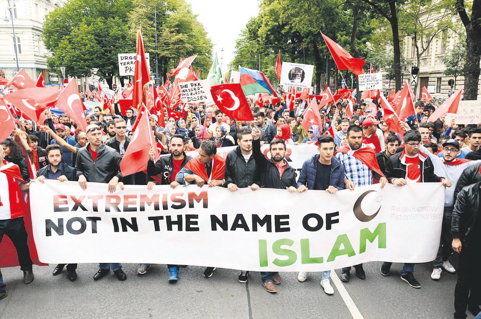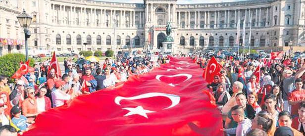 Avusturya Meclisi'nde terör örgütü PKK'ya destek veren milletvekillerine tepki gösteren gurbetçiler, yaklaşık 50 metrelik Türk bayrağı açtı. Terör örgütü karşıtı slogan atarak yürüyüşe geçen grup, terörle mücadelede hayatını kaybeden şehitleri temsilen Türk bayrağına sarılı tabutu Cumhurbaşkanlığı önüne bıraktı. Yolda PKK yanlısı gruplar ile eylemciler arasında zaman zaman tartışma yaşandı. Türk göstericiler daha sonra "Kahrolsun PKK" sloganlarıyla yeniden Heldenplatz Meydanı'na giderek basın açıklaması yaptı. DAEŞ, PKK, Boko Haram veya başka bir terör örgütü arasında hiçbir fark bulunmadığı belirtilen açıklamada, şu ifadelere yer verildi: "Avusturya Meclisi'nde PKK'yı koruyanlar var. Sadece Avusturyalı makamların değil, bütün devletlerin teröre karşı olan bu savaşta samimi hareket etmelerini ve dayanışma içerisinde bulunmalarını talep ediyoruz. Hiçbir can başkasının canından daha değerli değildir, tıpkı hiçbir teröristin başka bir teröristten daha iyi olmadığı gibi. Gelin teröre karşı bir ve beraber olalım." Yürüyüş, eylemcilerin hep birlikte İstiklal Marşı'nı okumasıyla son buldu.
