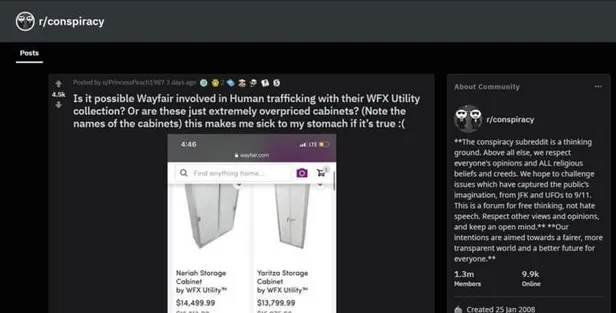 Teori ilk olarak PrincessPeach1987 rumuzlu bir kullanıcı tarafından Cuma akşamı Reddit üzerinden paylaşıldı. Paylaşımda, Wayfair sitesinde 12 bin