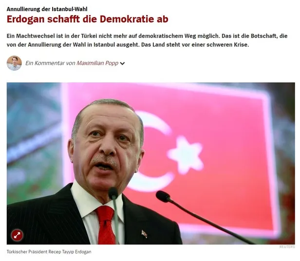 YSK'nın İstanbul seçimlerinin tekrarlanması kararının ardından batı medyası çirkin algı operasyonlarına başladı. Batı medyası Türkiye aleyhine algı haberleri yapmaya devam ediyor. Almanya'da özellikle Der Spiegel'in provokatif haberlerine devam ettiği görüldü. Avrupa'daki ve bazı Ortadoğu'daki ülkelerin Türkiye'deki seçimlerin anti demokratik olduğu manşetler yaptıkları görüldü. Avrupa'da bazı seçimlerde birçok usulsüzlük nedeniyle seçimin yenilenmesine rağmen demokratik olduklarını savunan batılı medyanın ve siyasi aktörlerin Türkiye için aynı şeyleri söylemekten kaçındığı görüldü.