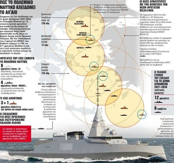 Gazeteye göre en ideali ise toplam 18 savaş gemisi sayısına ulaşmak. Ancak Yunan Deniz Kuvvetleri'nde şu anda 9 tane 40 yıllık 'S' tipi ve 4 adet de 30 yıllık 'Meko' tiipi fırkateyn var.