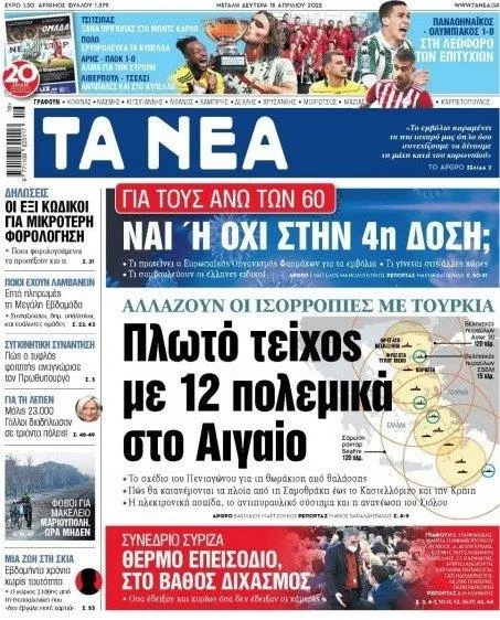 "Türkiye ile dengeler değişiyor. 12 gemi ile Ege'de yüzer duvar" başlığını manşete taşıtan gazete, Yunanistan'ın planlarını anlatarak 2021-2034 yıllar arasında 12 tane modern fırkateyn ve 6 adet korvete sahip olunması durumunda Ege Deniz'inde bir kilitlenme yaşanabileceğini söyledi.