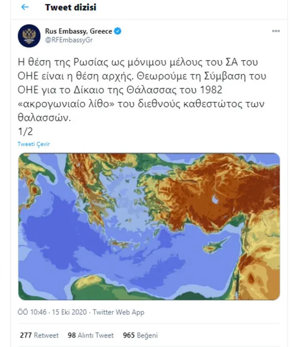 Söz konusu çıkarım, Atina'daki Rusya Büyükelçiliği'nin Ekim ayında Twitter'dan paylaştığı destek mesajı ile Türkiye ve Yunanistan haritalarına dayandırıldı. Milliyet'te yer alan habere göre, Yunanistan, İyon Denizi'ndeki kararı İtalya ve Arnavutluk'la anlaşarak hayata geçirdi ancak Türkiye ile arasındaki en büyük sorun, kıta sahanlığı.