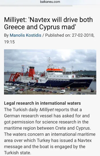 Dün Alman bilimsel araştırma gemisinin Kıbrıs ile Girit arasında yapacağı araştırma faaliyeti için Türkiye'den izin istediği, Türk deniz kuvvetlerinin de Navtex ilan ederek gemiye izin verdiği ortaya çıkmıştı. Bu haberin ardından Yunan ve Rum basınında hükümetlerini eleştiren sert yazı ve karikatürler çıktı. Yunan ve Güney Kıbrıs haber siteleri "Güney Kıbrıs yine uyuklarken yakalandı" şeklinde yazarak Rum yönetimine yüklendi. Bir başka haber sitesi ise SAIPEM 12000 sondaj platformunun bölgeden ayrılması ve Alman gemisinin Türkiye'den izin istemesiyle ilgili hazırladığı karikatürünü "Erdoğan'a en güzel tatil hediyesi" yorumuyla verdi.